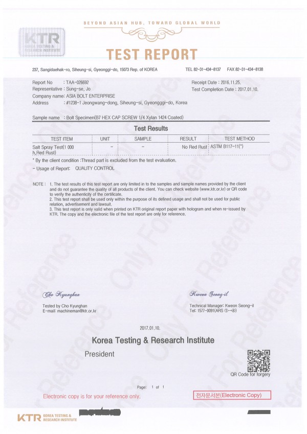 염수분무시험(SALT SPRAY TEST) 공인인증기관 성적서 입니다.